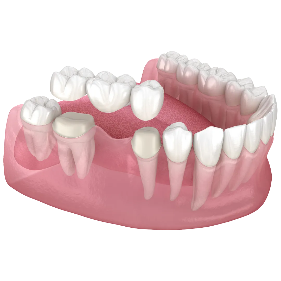 Le pont quant à lui, vient remplacer une ou plusieurs dents manquantes, en s’appuyant sur les dents adjacentes de l’espace édenté. Cette option est parfois un bon compromis si un implant n’est pas possible ou non souhaité. Dans ce cas, les dents adjacentes à l’espace édenté seront taillées et recouvertes de couronnes « jumelées ».